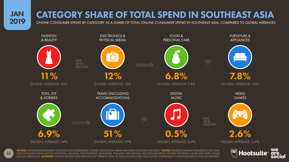 However, data from Statista’s Digital Market Outlook survey shows that the travel category accounts for more than half of all consumer online spend in Southeast Asia, so it’s worth adding some detail for this sector.